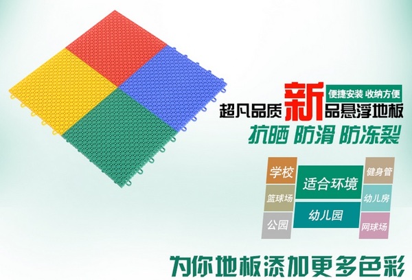 拼裝地板使用聚丙烯原料生產,無毒無味,安全環(huán)保,河北拼裝地板廠讓人們在一個健康的環(huán)境下玩耍;拼裝地板具有減震、能量回送性能及側向緩沖功能,可以防止運動傷害;拼裝地板原料聚丙烯為高強度材料,加入具有抗紫外線輻射、抗氧化、抗寒等成分原料,使該產品具有耐壓、耐沖擊、耐低濕、使用壽命長等優(yōu)點。耐候性高,不怕日曬高溫、雨淋潮濕、冰雪嚴寒、不易翹曲剝落變形。拼裝地板具有特殊的排水結構,雨后場地不積水;拼裝地板可以隨時拆卸和移動,讓您隨心所欲的DIY自己理想中的場地;拼裝地板廣泛應用于多種球場、幼兒園、賽事等,專業(yè)的運動性能有目共睹。